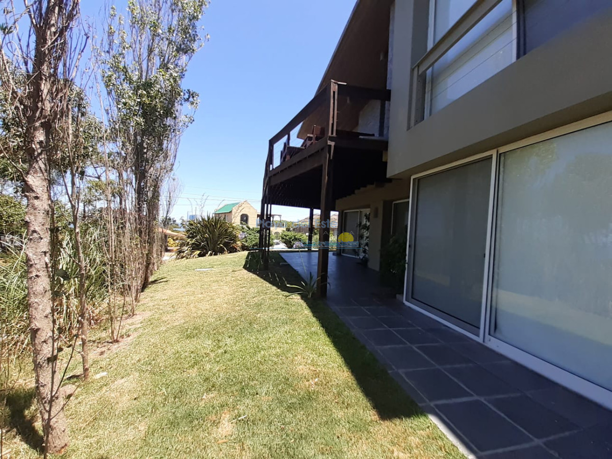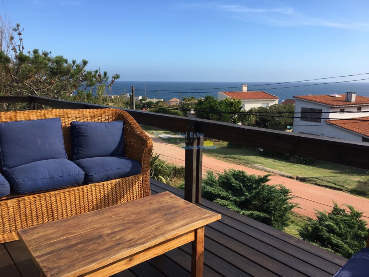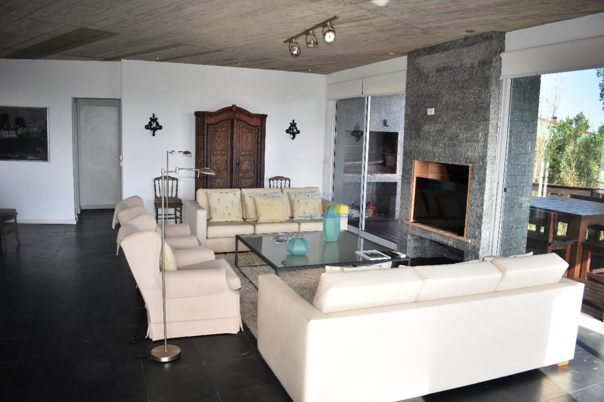 Living comedor con amplio balcón terraza tipo deck en madrea con vista al mar y parrillero, cinco dormitorios, cinco baños, cuatro en suite, cocina, palie de descanso, piscina, jardín, alarma , wi-fi, muy bien equipada.
