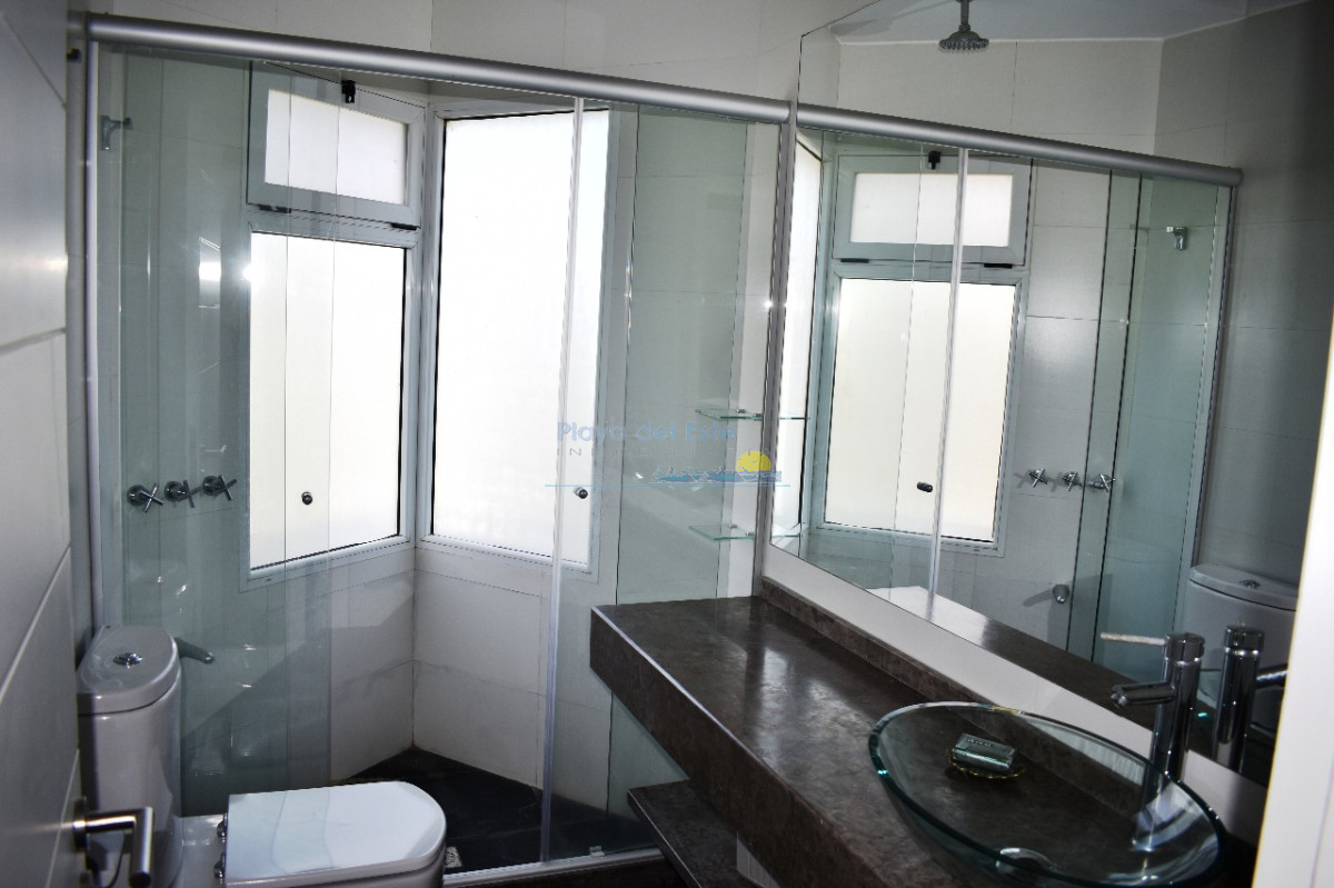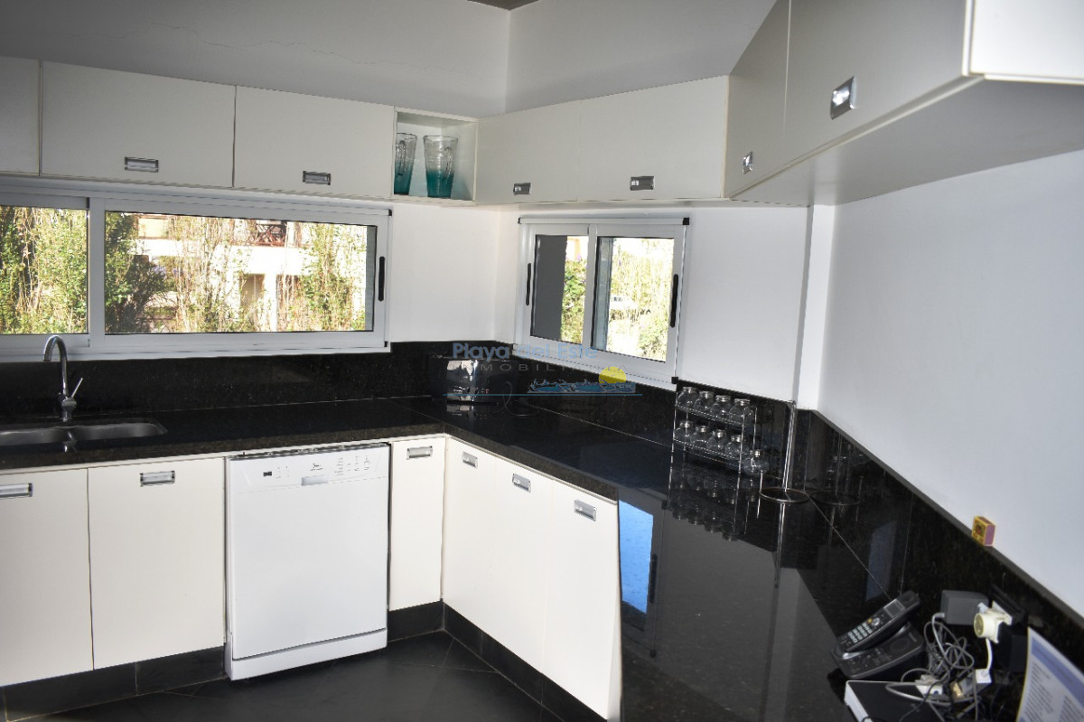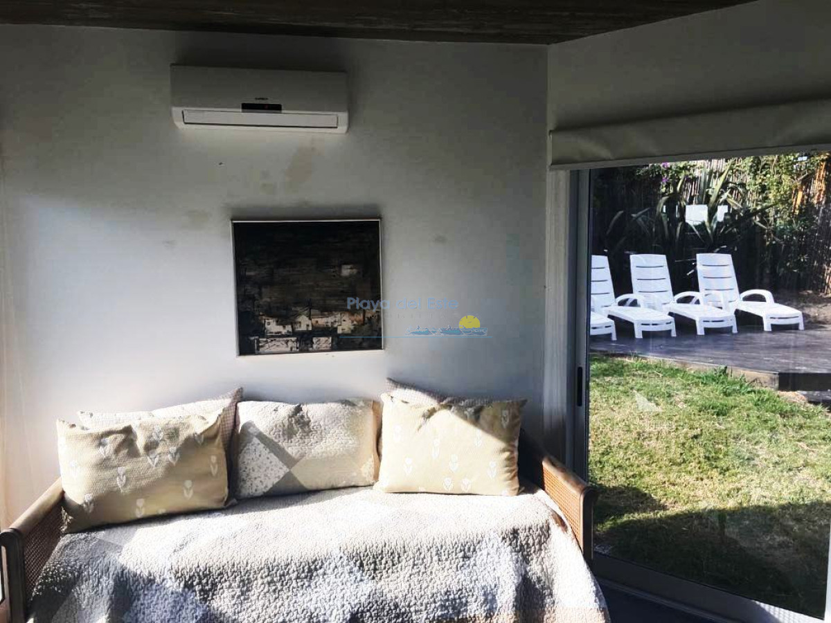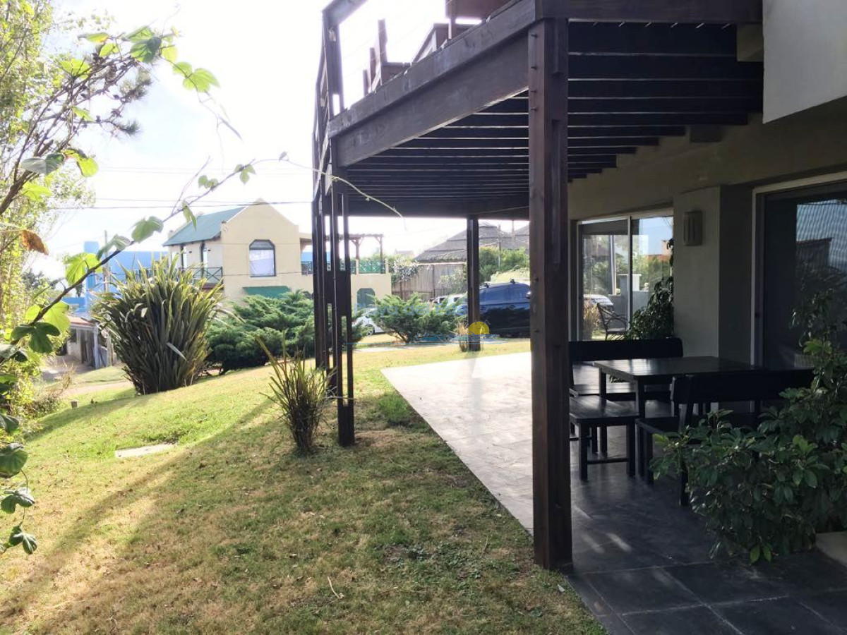 Living comedor con amplio balcón terraza tipo deck en madrea con vista al mar y parrillero, cinco dormitorios, cinco baños, cuatro en suite, cocina, palie de descanso, piscina, jardín, alarma , wi-fi, muy bien equipada.