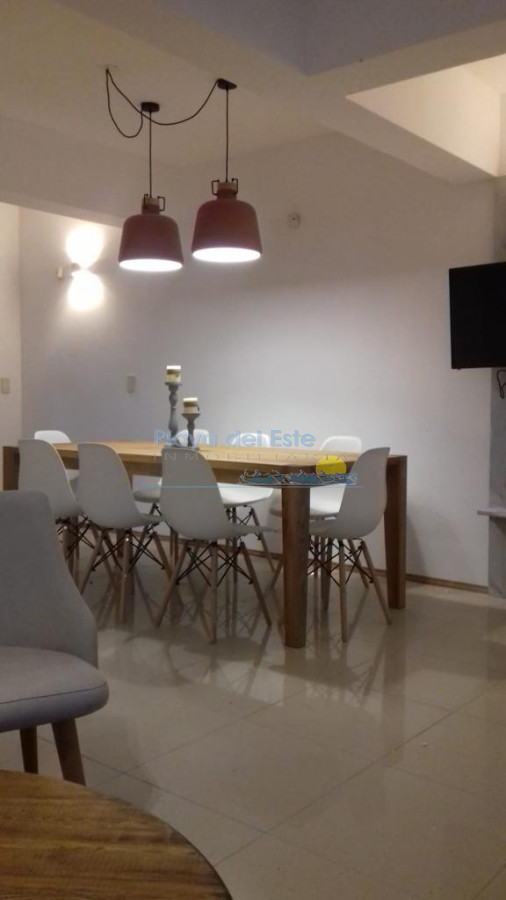 Ambiente grande con hogar y aire acondicionado en planta baja. Patio con churrasquero y lavadero. Baño secundario con ducha en planta baja y en planta alta 3 dormitorios. Primer dormitorio con cama matrimonial con tv. aire acondicionado y balcon al frente. dormitorio segundo y tercero con somier marinero. total capacidad de los 3 dormitorios 6 personas.. Baño principal con ante baño y bañera. Terraza con deck. Espacio privado para estacionamiento de dos vehiculos.